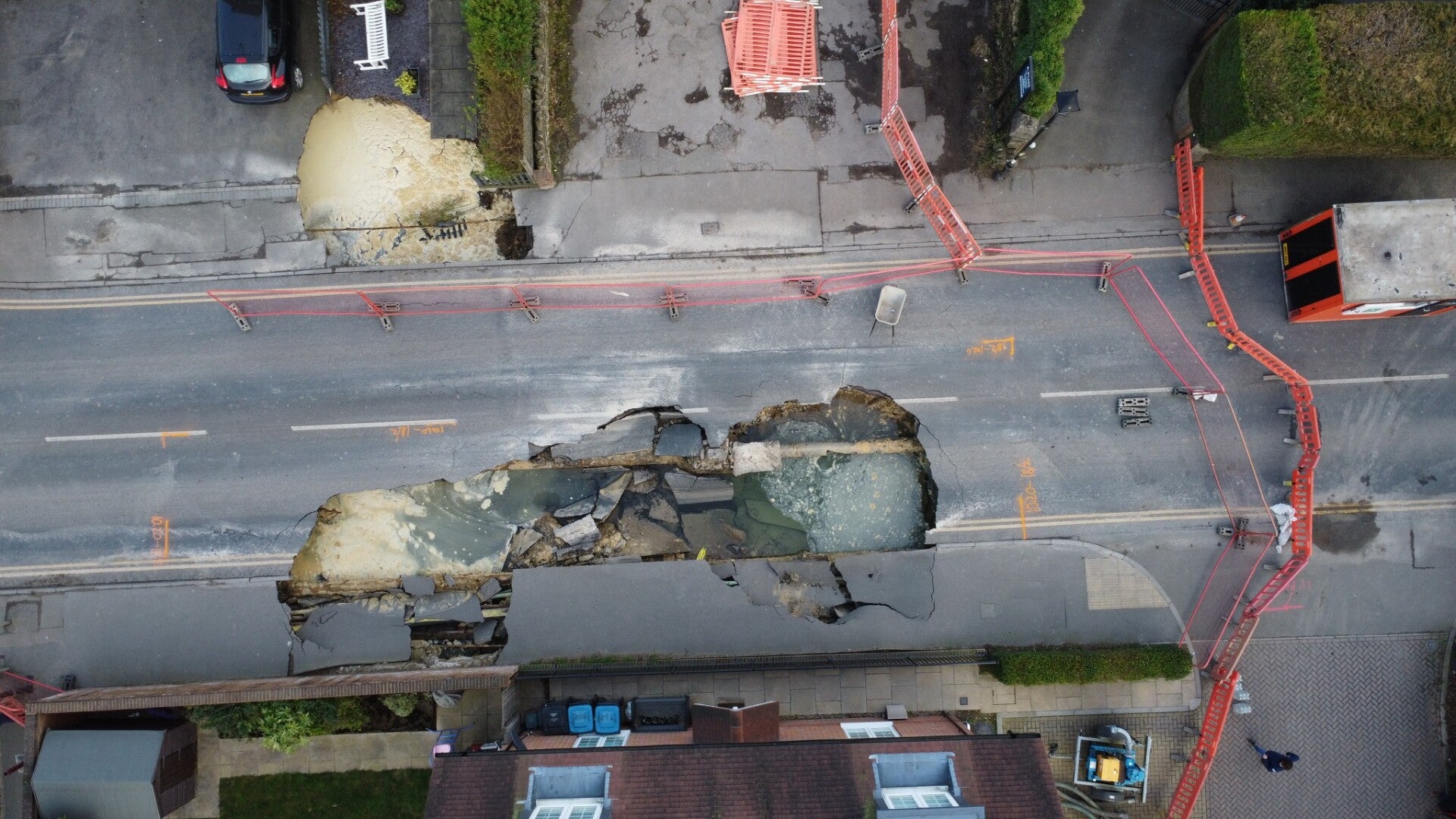 By 20 February, geologists had identified a burst water main as a probable contributing factor, suspecting it led to the wash-out of underground sands. Technical ground-assessment equipment and remote sensing, including radar, were brought in by 24 February to gain a clearer understanding of the subsurface conditions. Tandridge District Council had a requirement to utilise local support points to keep residents updated and provide assistance.